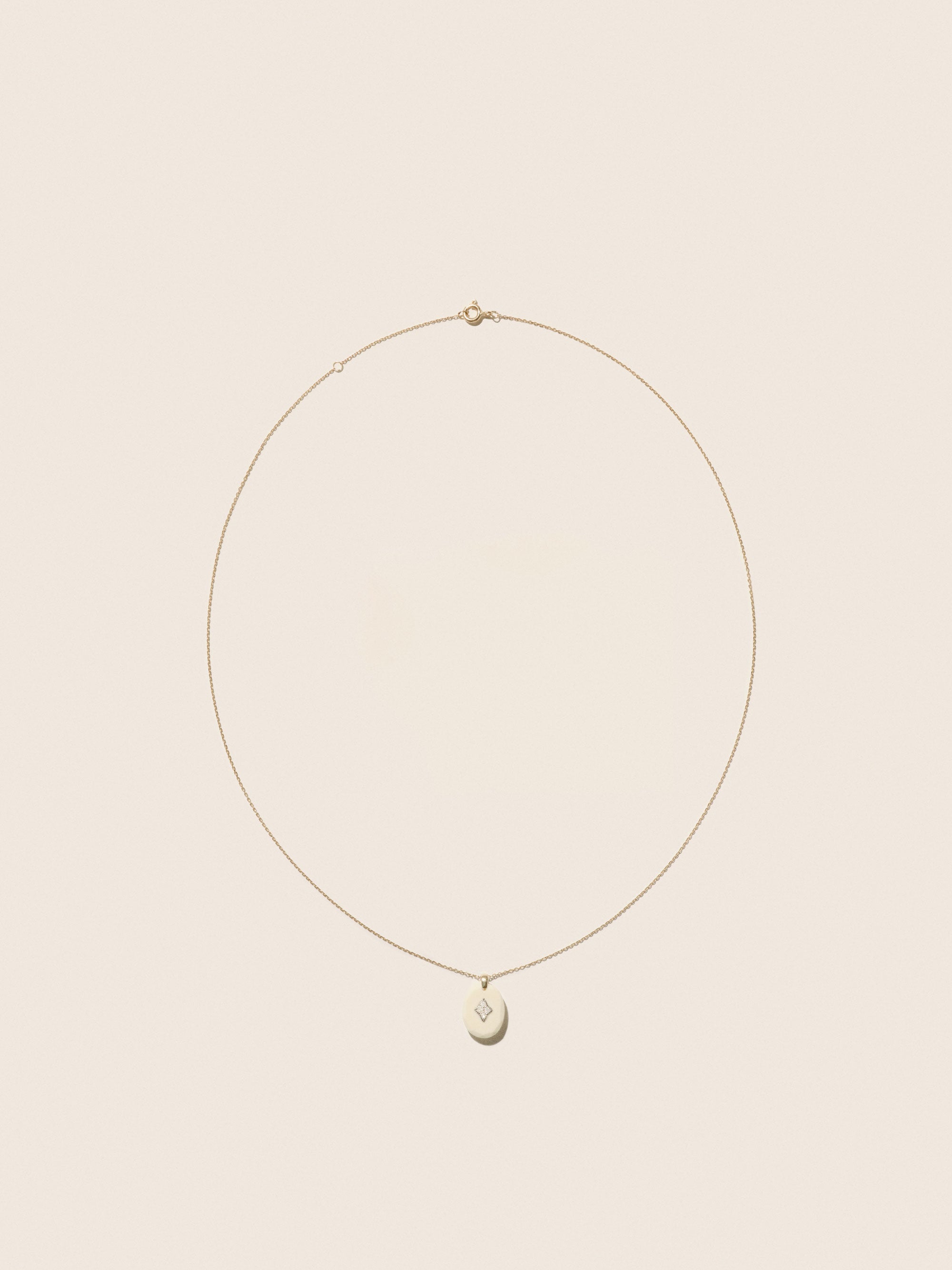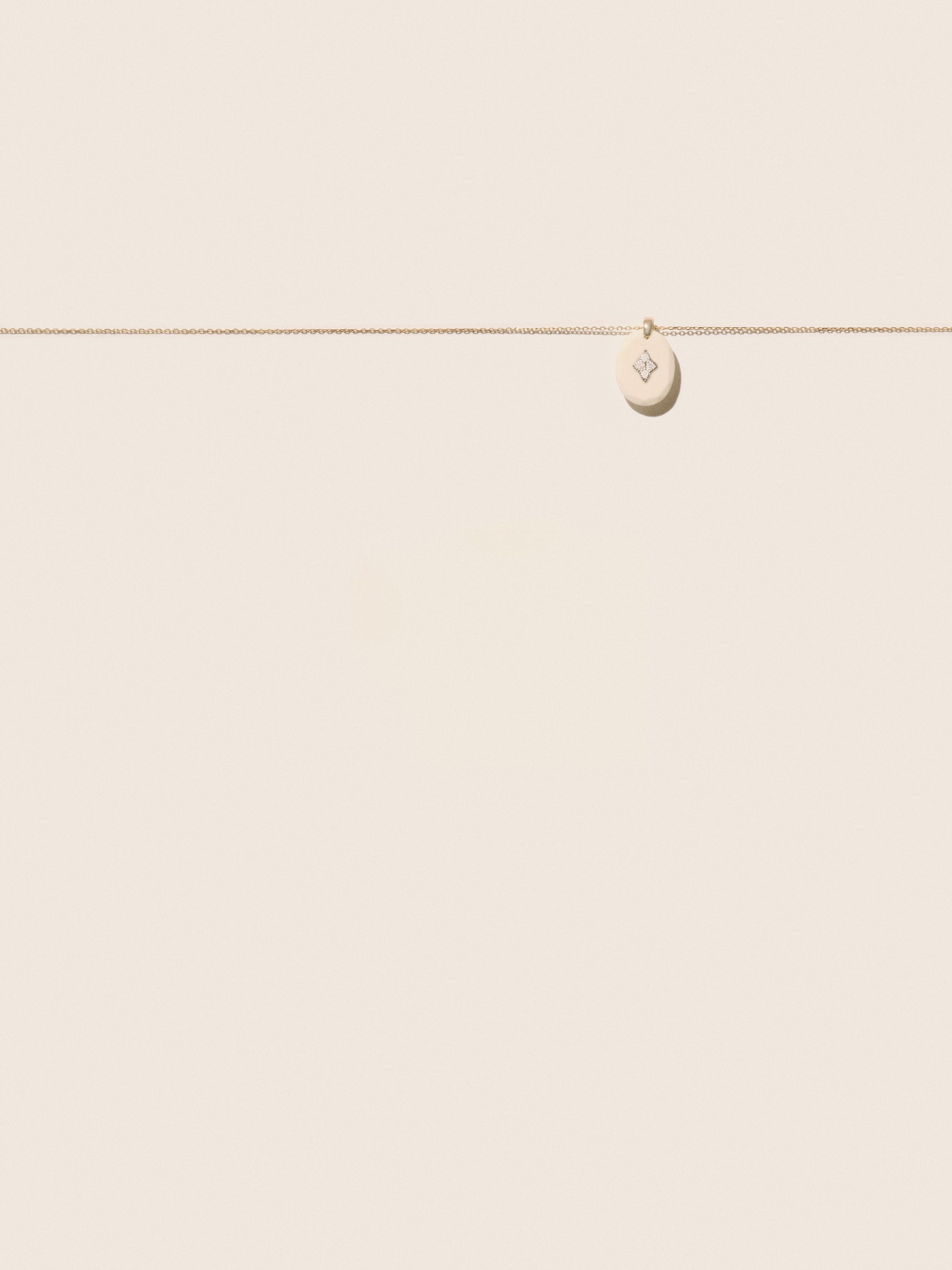 9kt geelgouden collier met een hanger gemaakt van wit hars ingelegd met diamantjes in witgoud.