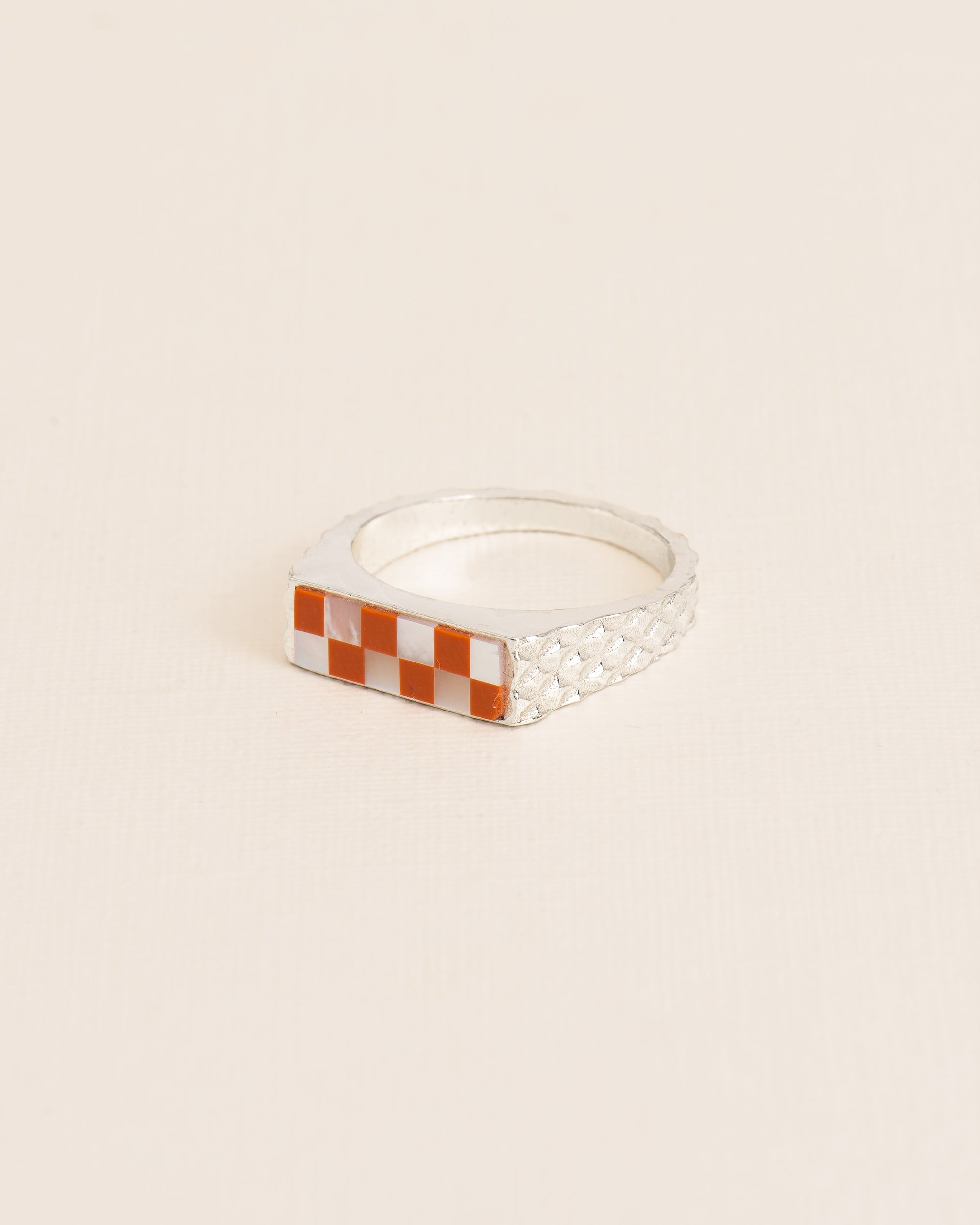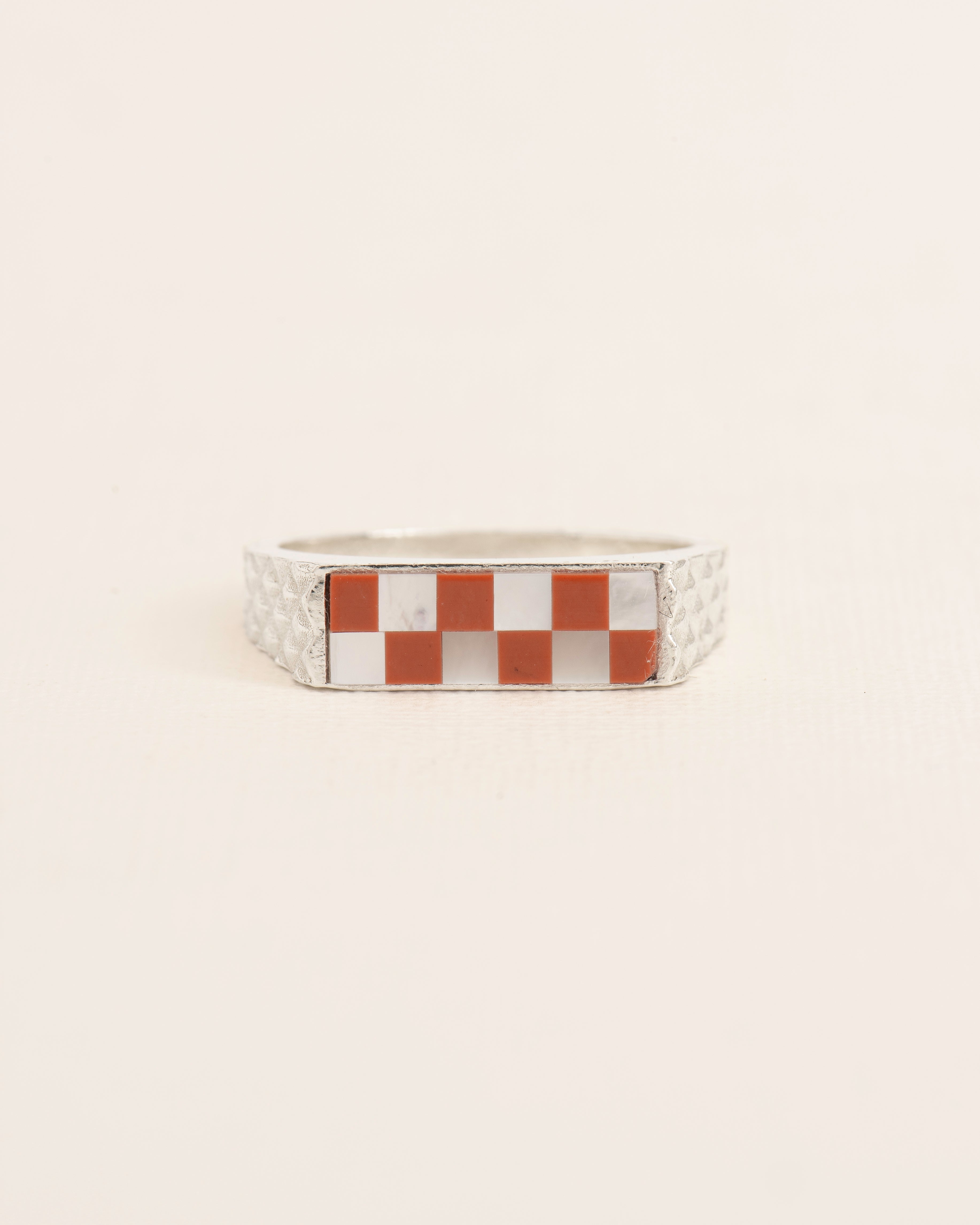 Dunne zilveren zegelring met mozaïek en diamantgeslepen structuur