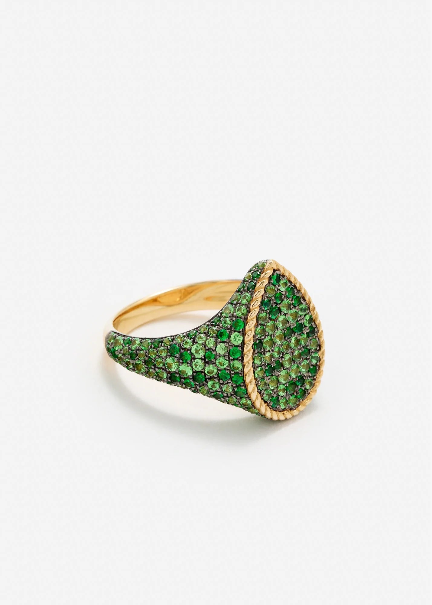 9kt geelgouden peervormige ring met bezet tsavorites.