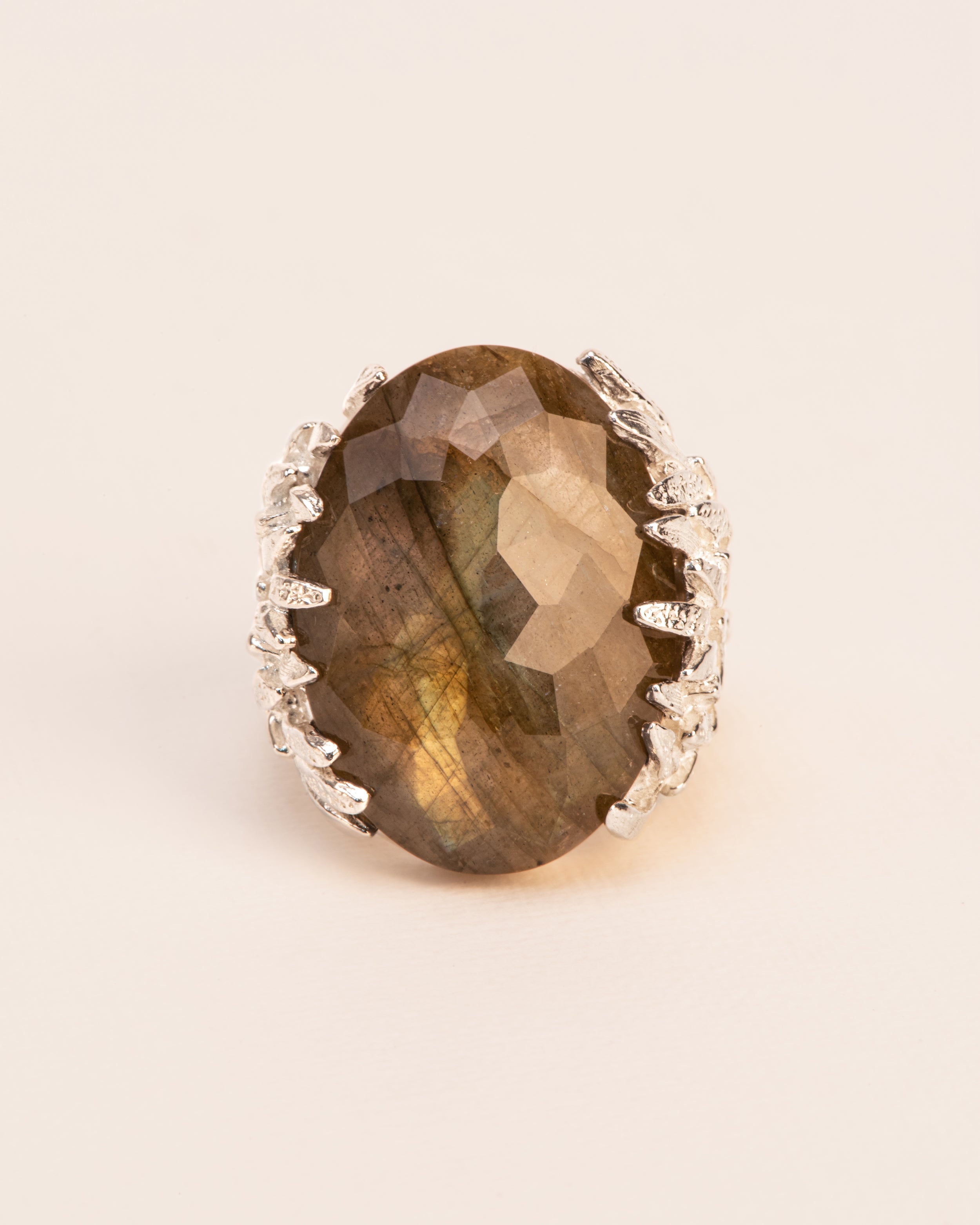 Labradoriet, in al zijn kleurrijke tinten, omarmd door een zilveren dek van veren. Elke ring is uniek, omdat de labradoriet in kleur varieert. Deze ring uit de collectie 'Voyages Naturalistes' is handgemaakt in het Wouters & Hendrix atelier in Antwerpen.